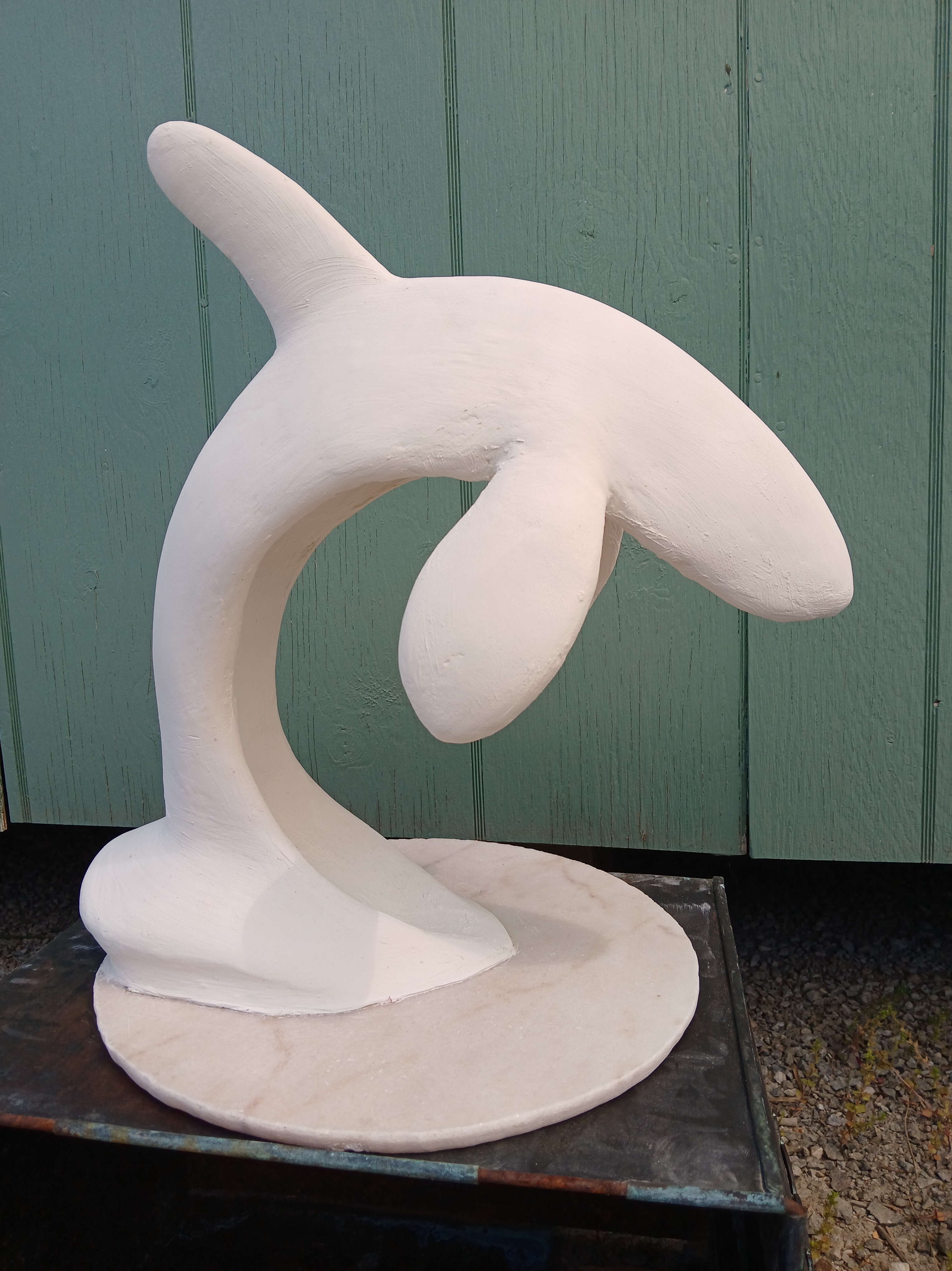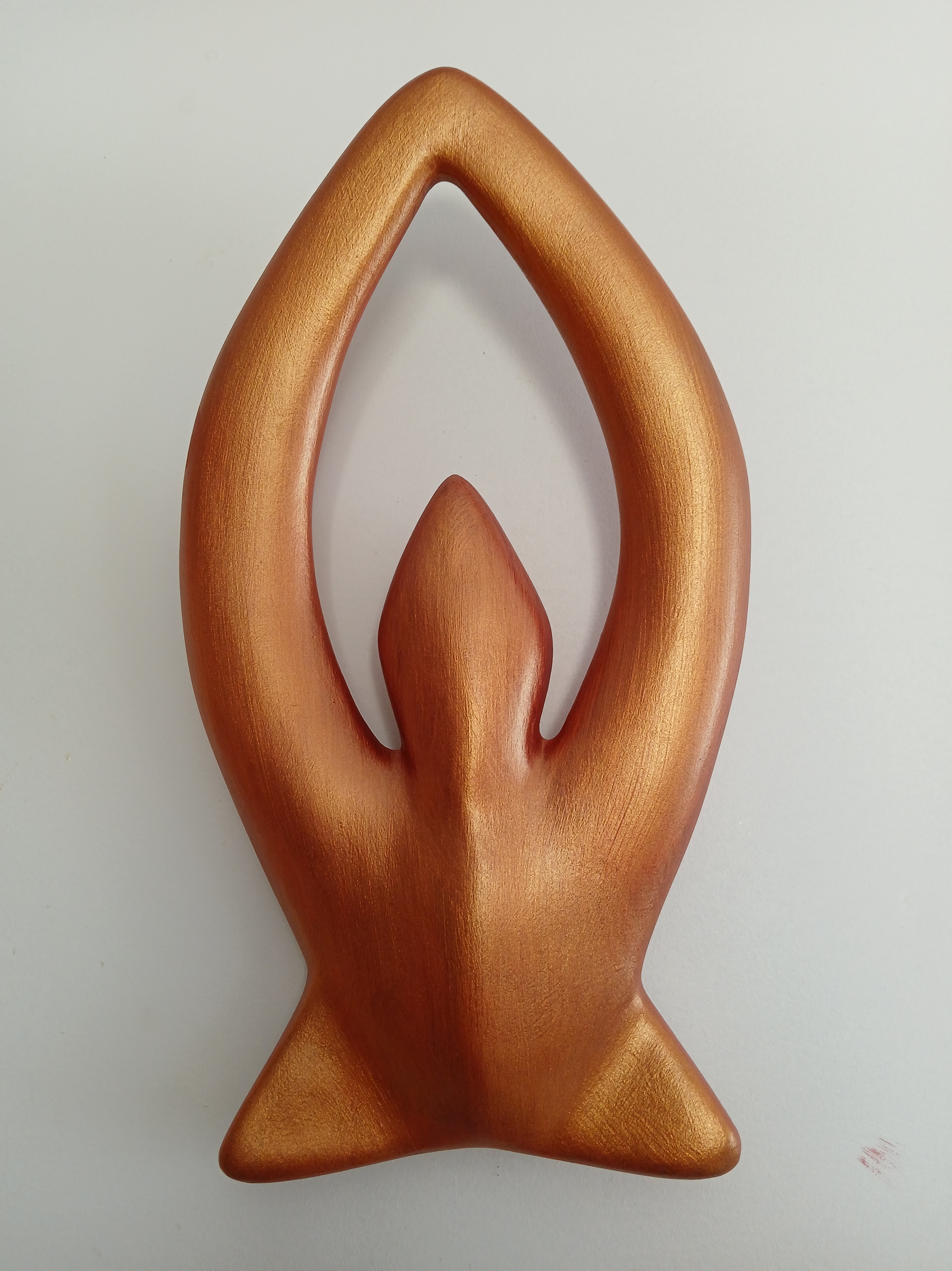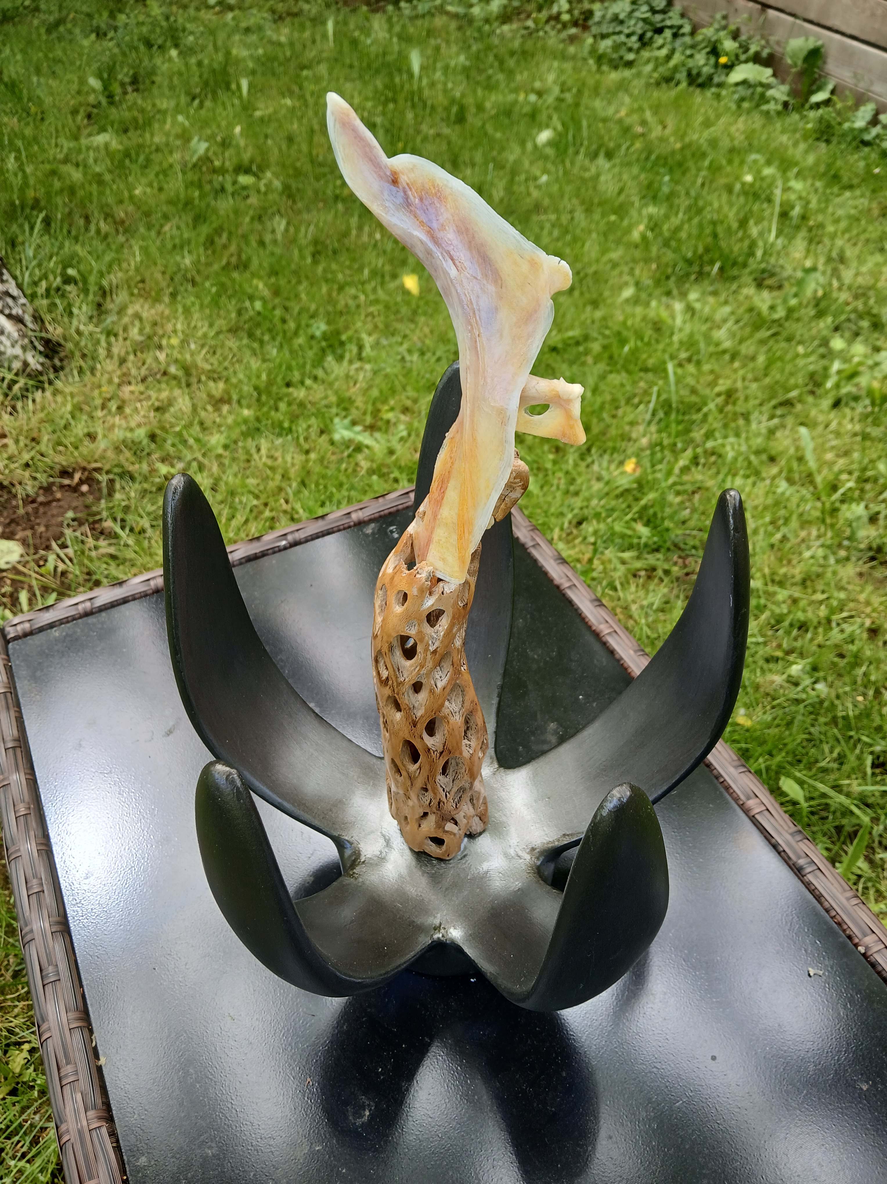 Embrace Life (2020) were my first table-top sculptures, I made four squarish ones (right) and then four curvier ones (center). All inspired by a sea shell sculpture called: Dive Into Life And death (left). The diving figure is a dolphin vertebrae.
