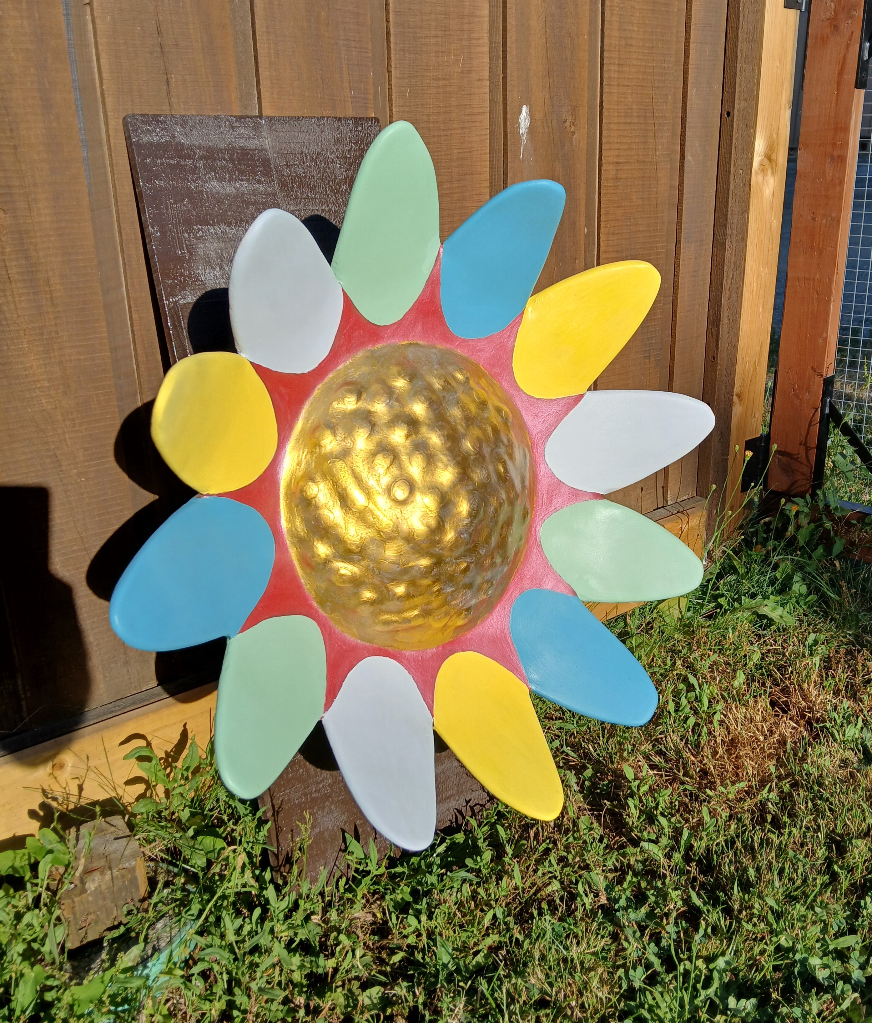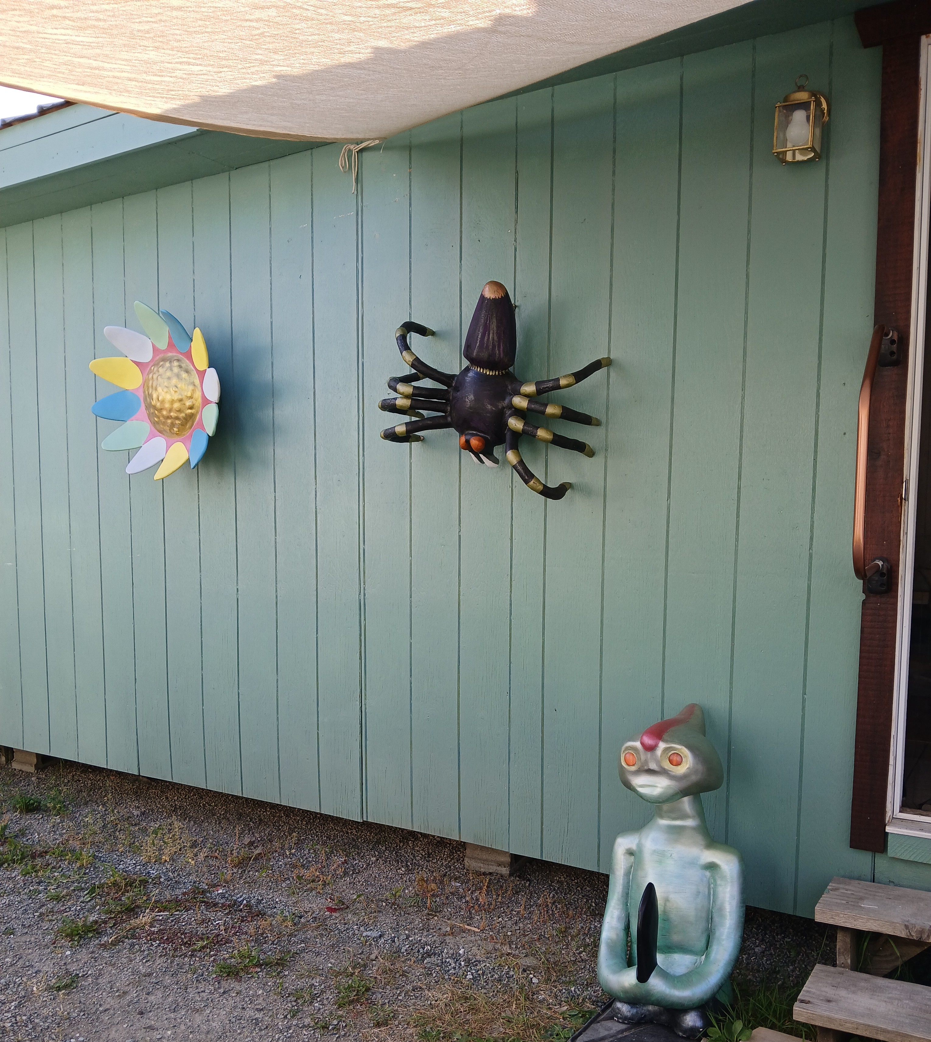 The last two larger sculptures i made are Big Spider (2019) and Big flower (2019). Both about two feet across and adorn the wall of my mini-home; the roof overhang protects them from weather.
