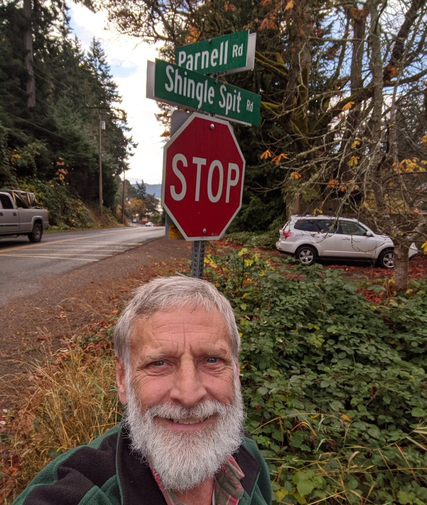 Having survived all that. . . .Gordon now lives on Texada Island, located just 28Km across the sea from his childhood playground immortalised in a song by John McLachlan, titled Shingle Spit Song. Gordon at the corner of Parnell and Shingle Spit roads.
